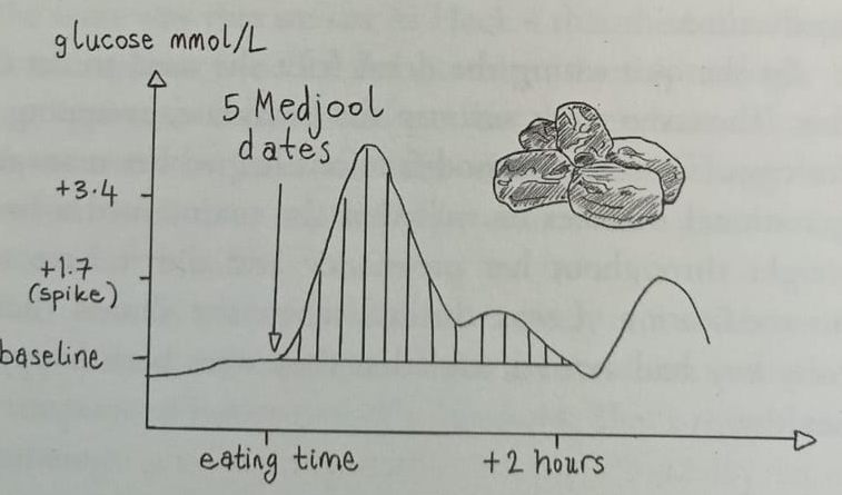 Este adevărat că în fructele uscate există încă fibre prezente. Dar, deoarece toată apa este extrasă din fruct, mâncăm mult, mult mai multe bucăți de fructe uscate decât bucăți de fructe întregi. Așadar, consumăm mult mai mult zahăr, mult mai repede decât a intenționat natura, ceea ce duce la creșteri mari de glucoză și fructoză.
